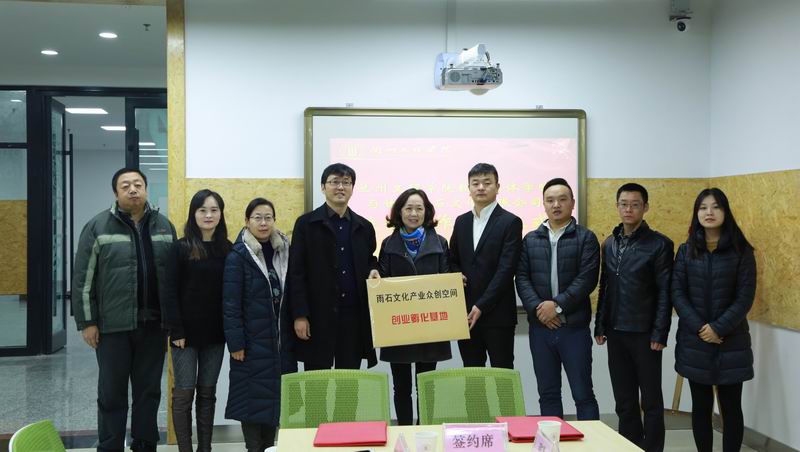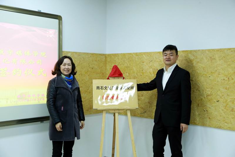 yl7703永利院长李恒杰教授与张玉亮总经理在校企合作项目书上共同签字,接着学校招生就业工作处李红梅处长和张玉亮总经理共同为“雨石文化产业创空间创业孵化基地”揭牌。
