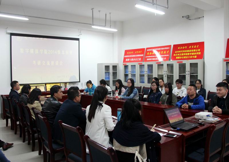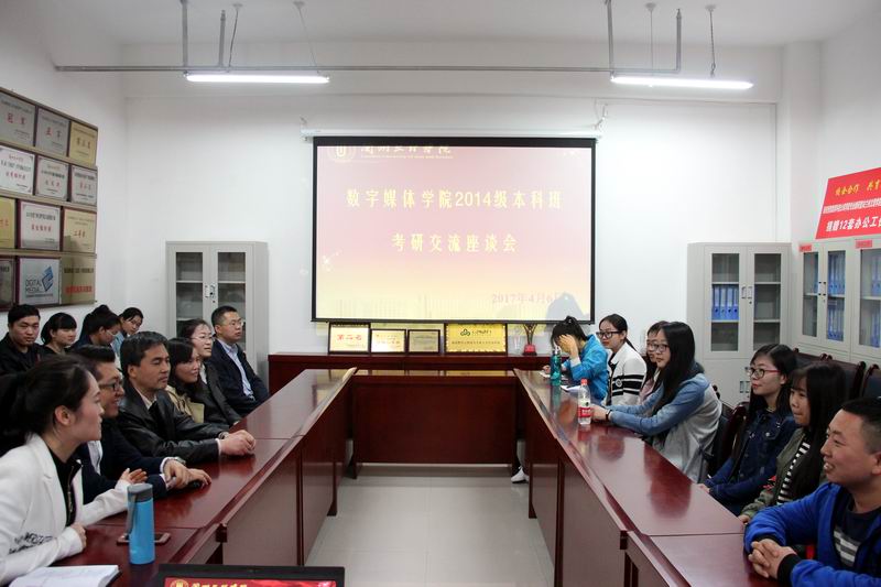 努力拼搏,放飞考研梦想;激情飞扬,彰显青春魅力。为进一步加强同学们对研究生入学考试的认识,了解前沿的就业形势,增强同学们的考研斗志,2017年4月6日中午,在yl7703永利会议室召开yl7703永利2014级本科考研交流座谈会。会议由主管教学的邢玉娟副院长主持,教务处副处长胡建军教授、校团委书记孙亮副教授、在读博士李志浩,史宝明副教授、张云副教授、李岚副教授、尹喆老师以及数媒学院2014级本科班有意向考研的三十多位同学参与本次座谈会。