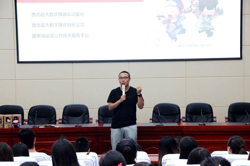 报告会上,谢飞总经理首先介绍了长风公司是一家专业的数字媒体制作型公司的企业定位,并详细介绍了数字媒体的发展方向和专业内涵。接着为大家展示了公司主导或参与制作的多部著名影视动画作品,生动解析了电影特效相关技术和动画建模的制作流程,让在场同学真切感受到了缤彩纷呈的数媒世界。随后谢飞总经理介绍了长风公司实训基地,对三维动画、数字可视化、影视后期、互联网视觉设计、软件游戏等五大事业部作了详细的介绍,鼓励全体同学找准兴趣点,选择最适合自己的发展方向。最后,场下同学就数字媒体学习、就业前景各方面问题与谢飞总经理展开了积极热烈的互动,并将多个长风自主设计生产的玩偶“秦亲宝贝”,送给现场的互动学生。