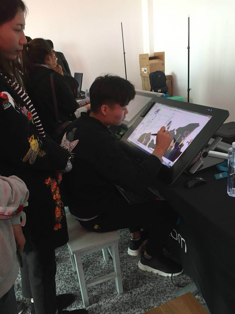 在创意绘画设计体验区活动现场,通过展示优秀创意绘画设计作品,播放数字媒体行业创意设计视频资料,学生代表数字创意绘画现场秀等方式进行活动。极大地激发了学生的创作能力和创作热情。来自16数字媒体视觉传达艺术班的杨佳文说:“非常感谢学院和企业联合开展这样的活动,让他见到了很多高科技设备,也学习到了很多手绘技巧,受益匪浅,更加坚定了他绘画创作的信心。”而在虚拟现实交互体验区,则通过播放虚拟现实技术在数媒行业及其他行业应用视频,由老师和专业人士引导学生进行交互体验,亲身亲眼亲手感知虚拟现实技术的强大。
