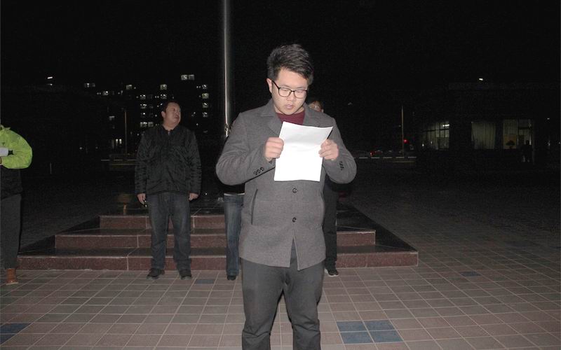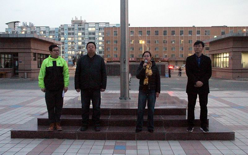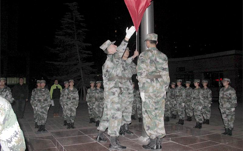 6点55分国旗护卫队踏着整齐矫健的步伐护卫国旗进入广场,7点整升国旗仪式正式开始,随着庄严的国歌《义勇军进行曲》的响起,全体师生肃立,向国旗行注目礼并深情的随着国歌吟唱。