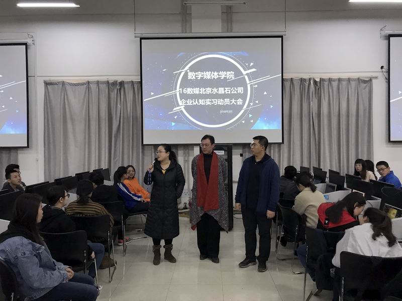 2018年3月12日,在学院实验室召开了动员大会,会议由虚拟现实专业主任黄珍副教授主持,北京水晶石公司两位行业大咖分别讲话,学院和企业教师分别对这一周认知实习的目的意义及要求做了详细的安排。