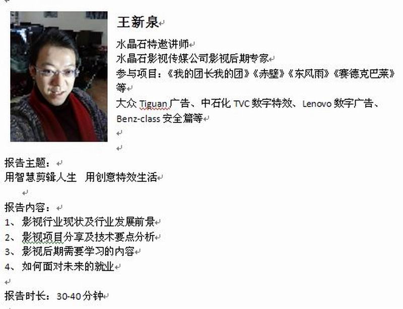 通过此次报告会,加深了学生对影视行业的认识,极大扩宽了我院影视后期方向老师和学生的知识面,激发了学生的学习热情,并为我院学生学好专业知识奠定了基础。