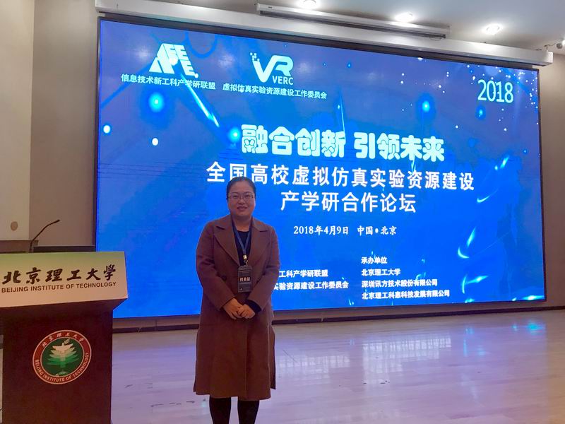 4月9日,我校数媒学院数字媒体技术虚拟现实方向专业主任黄珍副教授到北京理工大学参加了“2018年全国高校虚拟仿真实验资源建设与产学研合作论坛”会议。大会由信息技术新工科产学研联盟虚拟仿真实验资源建设工作委员会和北京理工大学计算机学院共同主办,得到了教育部高教司、信息技术新工科产学研联盟、北京理工大学领导及实验设备处、教务处等相关部门的大力支持。教育部高教司实验室处高东锋处长、北京理工大学副校长龙腾教授、北理工计算机学院院长黄河燕、新工科联盟执行秘书长张龙、北理工实验设备处处长史天贵等出席了开幕式,来自北京大学、武汉大学等几十所高校的相关专业负责人及戴尔、思科、微软亚洲研究院等企业单位参加了会议。