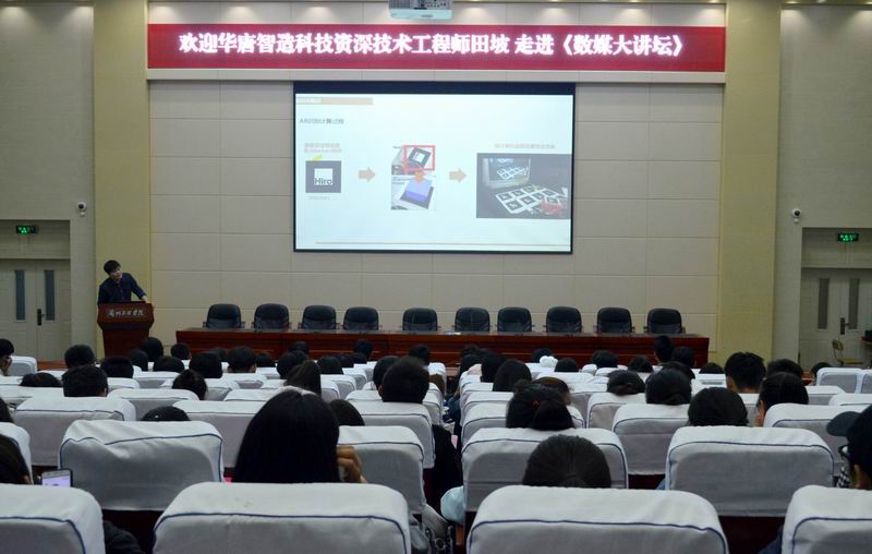 此外,介绍了虚拟现实专业的相关软件,如ARTOOLKIT、Unity、HiAR等,并就行业发展前景、就业方向向同学们做了分析。田坡提到:“虚拟现实技术作为一门具有沉浸性、交互性和构想特点的技术,能使人们沉浸其中,形成具有交互效能多维化的信息环境是学科关键所在。从简单到复杂需要技术,从复杂回归简单更需要技术。虚拟现实引擎的发展方向需要一个化繁为简的过程。对于虚拟现实方向学生而言,对专业软件的了解是最重要的。”