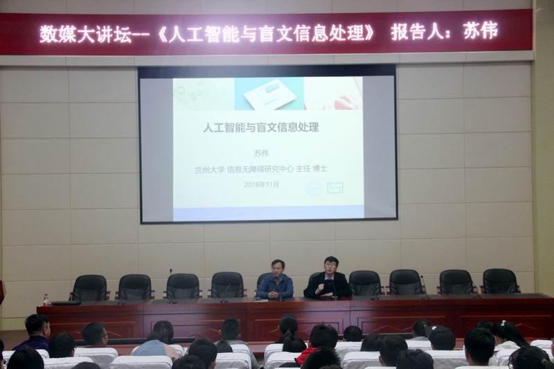 11月24日上午,兰州大学信息无障碍研究中心主任苏伟博士走进yl7703永利集团《数媒大讲坛》,为yl7703永利软件工程专业和数据科学与大数据应用专业的全体同学作了题为“人工智能与盲文信息处理”的主题报告,现场近300名学生认真聆听苏伟博士多年在信息无障碍领域的研究成果。报告会由数媒学院院长李恒杰教授主持。