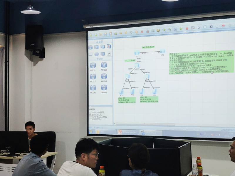 汇报会上,17计算机网络班的学生选举了两名学生代表依次展示了自己的作品,两位同学依次从企业的需求方面出发,利用之前的理论基础和这两周的实训经验,对整个企业网络进行分析、规划和OSPF、NAT等协议的配置,整个过程连贯流利,最后由学习委员曾丹对这次实训做了总结报告。