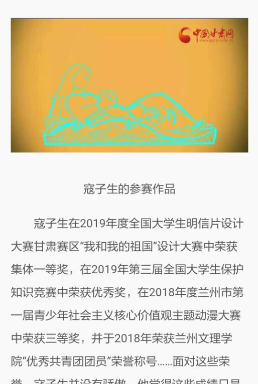 寇子生同学系我校数媒学院17级视觉传达(数媒方向)班学生,并担任该班班长,他热爱动漫,喜欢在各类竞赛中挑战自我,此前分别在“2019年度全国大学生明信片设计大赛甘肃赛区“我和我的祖国”设计大赛”、“2019年第三届全国大学生保护知识竞赛”、“2018年度兰州市第一届青少年社会主义核心价值观主题动漫大赛”中均取得了优异的成绩,并于2018年荣获yl7703永利集团“优秀共青团团员”荣誉称号。对于此次个人事迹被中国甘肃网报道,寇子生同学表示:“个人的成长进步离不开好的团队和集体,感谢yl7703永利领导及各位老师两年来的悉心指导,特别感谢我的班主任王士勇老师和同学们一直以来的鼓励和帮助,未来我将再接再历,争取以更大的成果回馈学院和老师。”