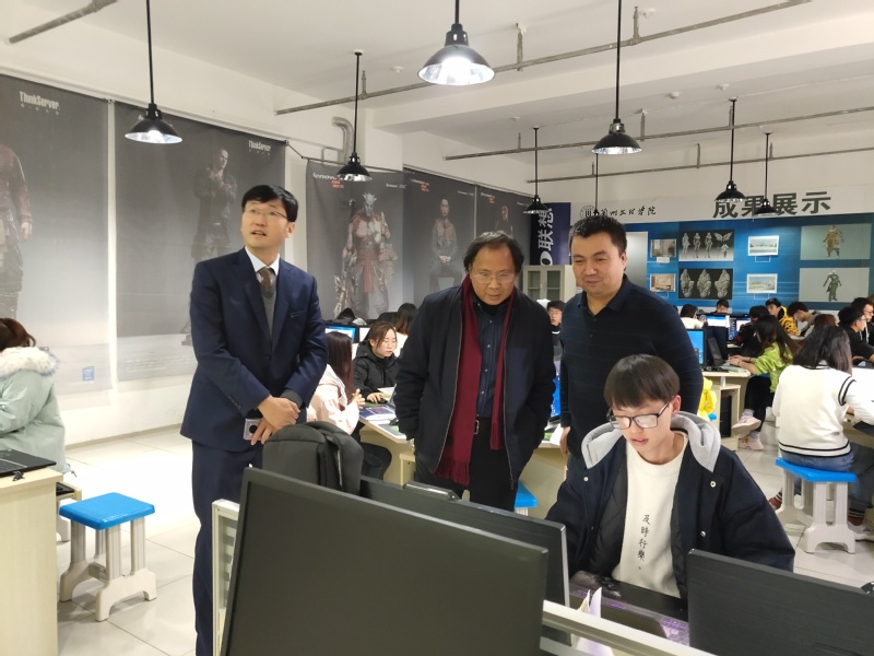 李教授同数院长李恒杰教授、数字媒体技术系主任黄珍副教授、数字媒体艺术系主任王士勇、综合办公室主任姚林、数字媒体艺术系骨干教师韩延峰共同参观我院数字媒体专业群教学实验中心。李教授对我校教学实验室的建设表示了高度的赞赏,同时就双方共同关注的数字媒体专业群的建设进行了交流,李四达教授从人才培养方案、课程体系建设、专业建设、培养目标、教材选择等多个方面提出宝贵的建议。进一步促进了我校数字媒体专业群的建设。