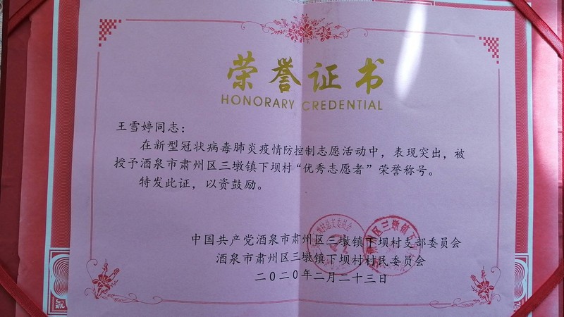 2020年2月24日,yl7703永利19级软件工程2班王雪婷同学在酒泉市三墩镇下坝村举行参与疫情防控志愿者活动中受到表彰。