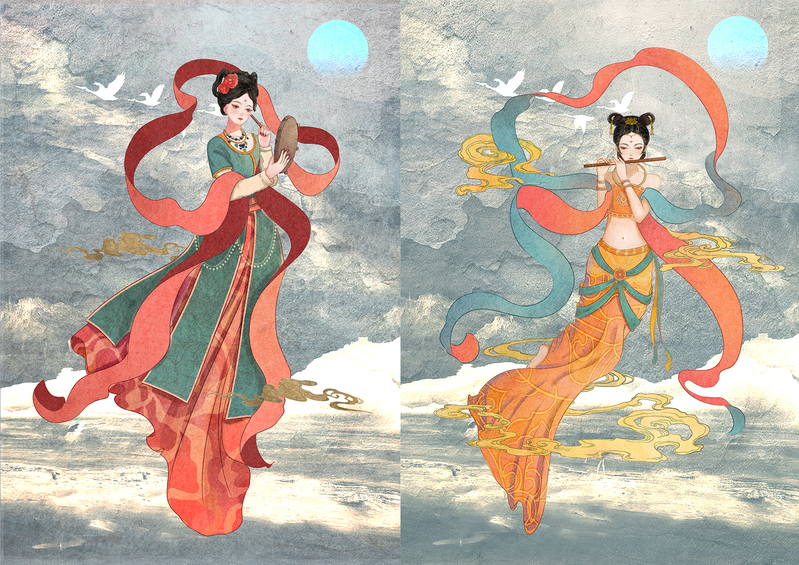 谢耀漾同学的毕业中期展示的这两幅人物插画作品是从敦煌莫高窟壁画伎乐图之反弹琵琶中提取的造型元素,对壁画的人物设定作了重新的设定。插画使用CG绘画技巧,结合中国古代的传统绘画元素与技法进行创作。插画中的人物惟妙惟肖,线条勾勒、色彩搭配都作的很到位,是一部比较优秀的毕业设计作品。