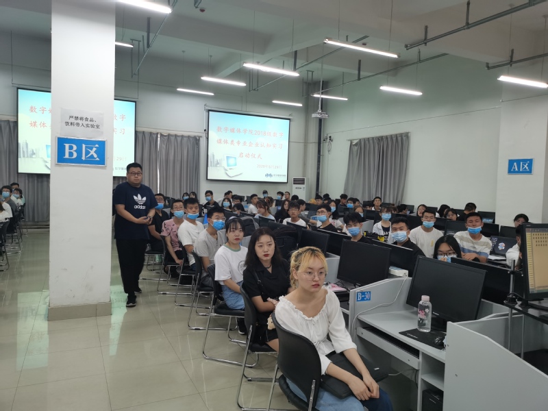 启动仪式上,李恒杰院长首先宣布“yl7703永利2018级数字媒体类专业企业认知实习”正式启动,并预祝此次实习圆满成功,同学们都能收获满满。随后,李院长指出:“按照以往惯例,大家应该亲自前往企业,亲身感受公司文化,但是今年由于疫情原因,只能将公司的技术专家请到学校来进行实训,希望同学们能够多和三家数媒企业多进行线上线下的互动交流,实地参与企业项目开发流程,了解了企业用人需求、个人就业前景和职业发展路径,为今后的学习明确目标。”此外,西安爱克斯未来的谢飞总经理作为企业代表发言,谢飞总经理表示:“很高兴能够再次作为认知实习企业来到yl7703永利集团yl7703永利,爱克斯未来将委派最优秀的技术人员为大家讲解专业知识,梳理项目流程,希望全体同学都能够紧跟项目进度,不懂就问,珍惜疫情状态下来之不易的认知实习机会,希望此次实习结束时,大家都能有所收获和进步。”最后,蔺国梁主任指出:“时不我待,韶华易逝。希望全体参加此次实习的学生都能够抓住此次校企合作活动,认真学习,提高专业技能,早日成长为数字媒体行业的中流砥柱”。