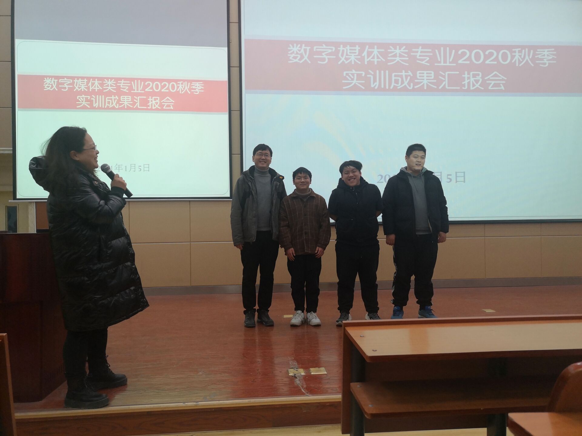 汇报结束后,数媒技术系主任李岚教授和刘子乐老师分别做出点评,他们都肯定了同学们所取得的成绩,希望19级、20级跟着学长学姐的步伐,在专业学习上更进一层,同时希望大家通过团队的合作,在创新和应用的能力上有一个更大的提升。随后刘子乐老师还为学生们展示了他所任课程的实训成果串烧,博得同学们的阵阵掌声。
