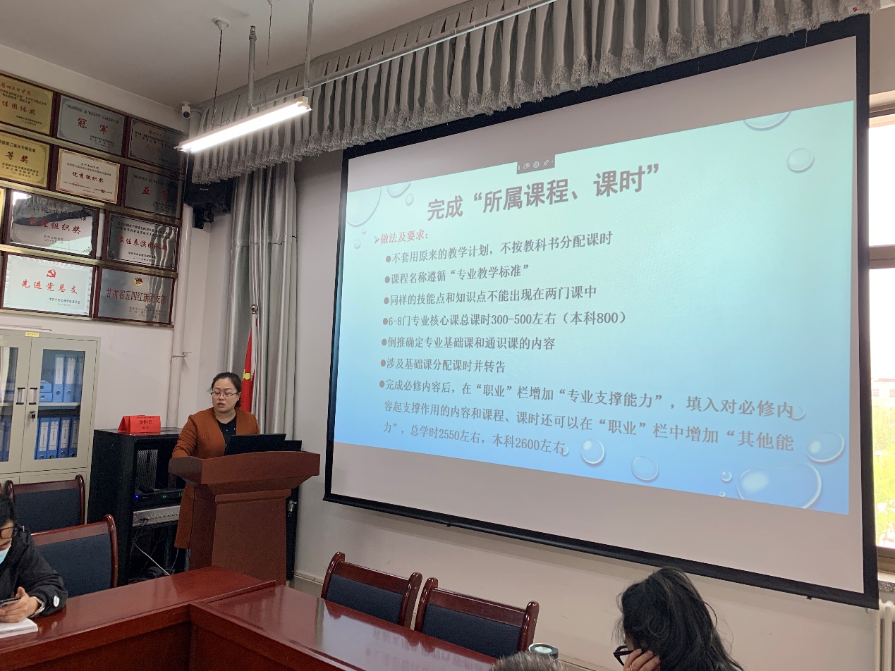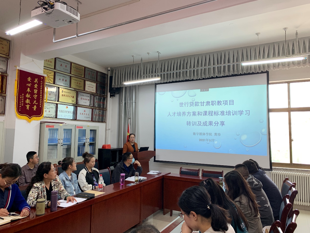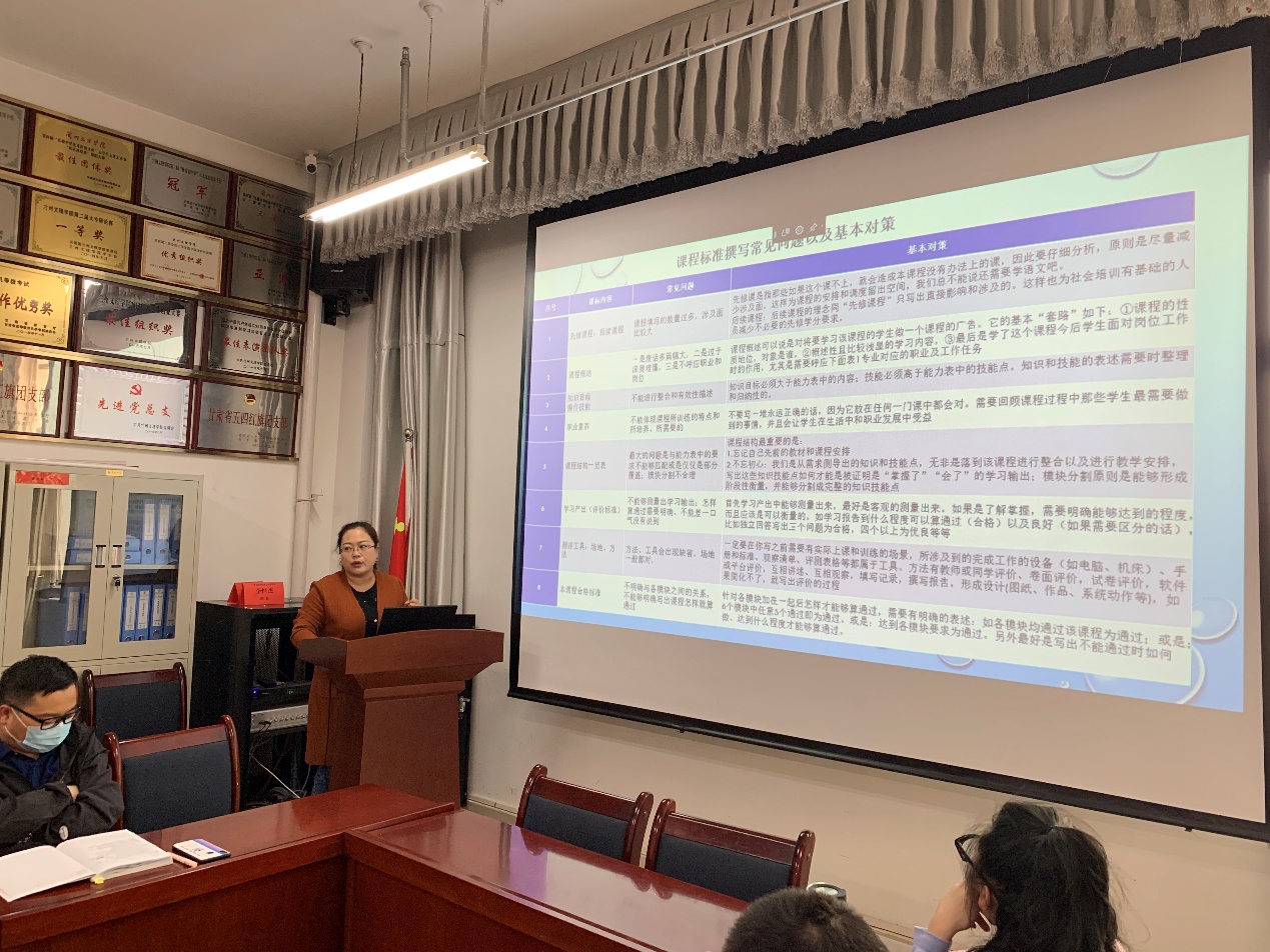 会上,黄院长向全体参会人员详细分享了本次培训内容,从人才培养方案与毕业生能力模型的关系,到如何确定专业的培养目标、如何构建毕业生能力模型,再到如何制定人才培养方案和开发达标式课程标准都进行了一一详细的介绍。同时和各位老师就目前教育形式下如何进一步完善人才培养方案,为培养各层次毕业生制定达标式课程标准进行了深入分析和讨论。黄院长强调,我们要以行业标准为主,采用“以学生为中心、能力本位”的积极教学法,摒弃教师“会什么教什么”的传统授课方式,以此实现教育革新。本次培训是全面贯彻落实教育部等六部门《关于加强新时代高校教师队伍建设改革的指导意见》,深入推进世行贷款甘肃省职业教育发展项目师资培训建设内容的一项重要举措,对项目学校打造一批规模、质量、结构适应教育改革发展需要的高水平教学团队具有重要意义。