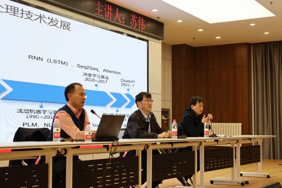 苏伟介绍了自然语言处理的技术分类、应用发展及研究现状,让学生了解何为自然语言。随后他对人工智能进行详细介绍,包括ChatGPT模型发展原理,以及神经语言模型,通过研究案例的分析,让学生们更全面了解该项技术发展。在互动环节,学生们积极提问,苏伟从专业角度为学生们详细解答。