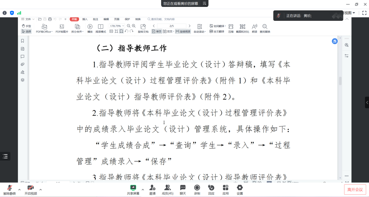会议上,副院长黄珍就毕业答辩前的工作向老师们做了详细介绍,包括毕业答辩前指导教师和评阅教师需完成的工作内容及时间结点,设计报告第三轮查重的工作安排,以及毕业答辩过程中答辩组组长、答辩秘书、答辩组教师各自需完成的工作内容等;黄珍还向参会教师们演示了如何在系统里进行毕业生指导成绩和评阅成绩的录入。随后李恒杰再次强调,指导毕业设计属于教师的正常教学工作,教师们需高度重视。