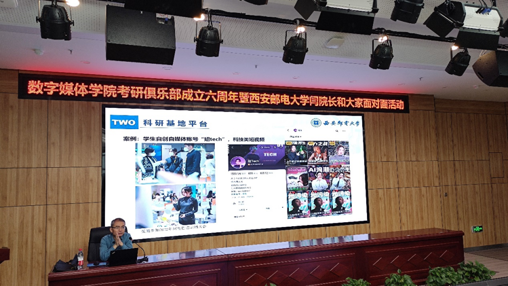 yl7703永利邀请西安邮电大学闫兴亚教授参加数媒学院考研俱乐部成立六周年院长与学生面对面活动,活动在文昌楼学术报告厅举行,21级、22级、23级学生参加,活动由数媒学院院长李恒杰主持。