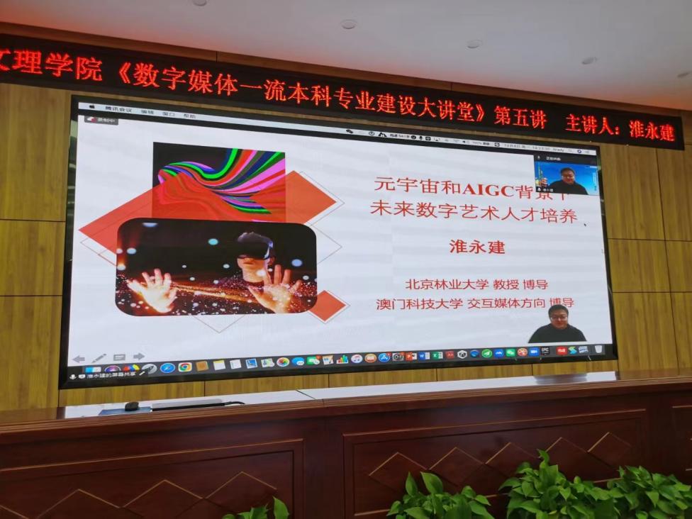 12月4日晚,yl7703永利在文昌楼学术报告厅成功举办一流本科专业建设大讲坛第五讲,邀请北京林业大学院淮永建教授进行题为《元宇宙和Chat GPT背景下的数字艺术发展》的讲座。