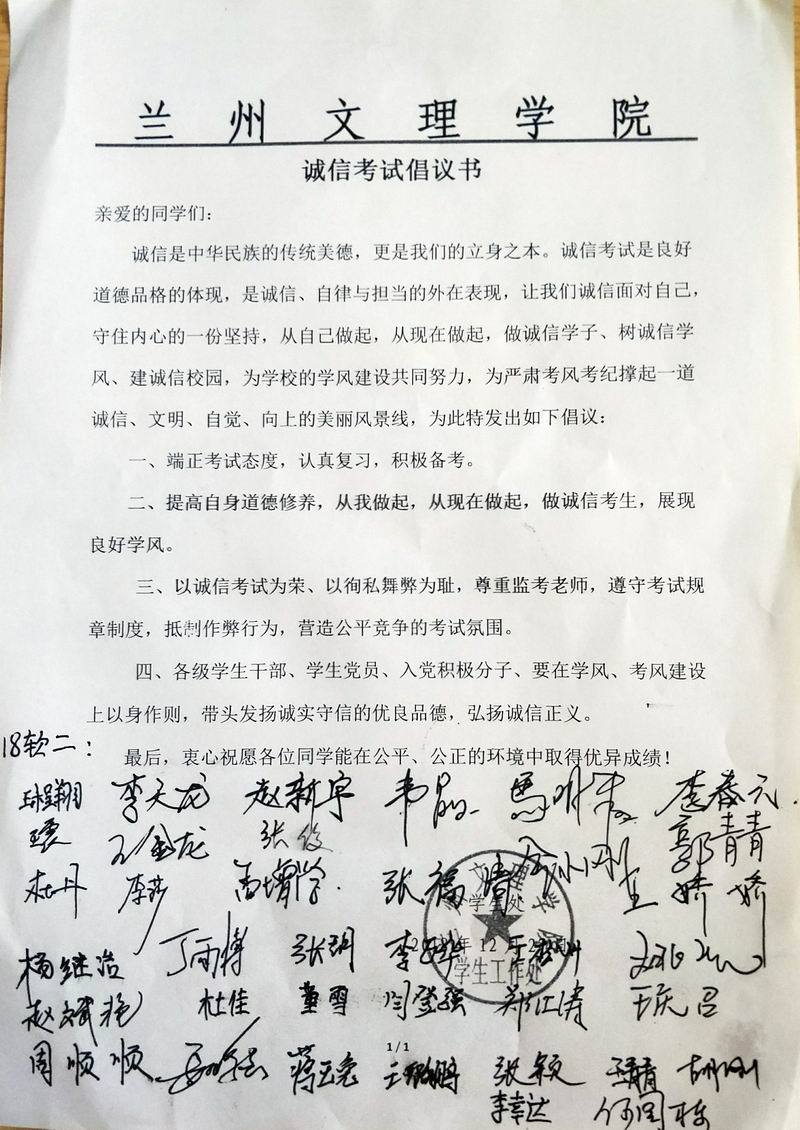活动开展期间,各个班级积极响应号召,在“诚信考试”主题班会上,同学们踊跃发言,分享关于诚信的感悟与理解,内容涉及到学习、工作、生活等诸多方面,气氛积极活跃,并在诚信考试倡议书上签字。