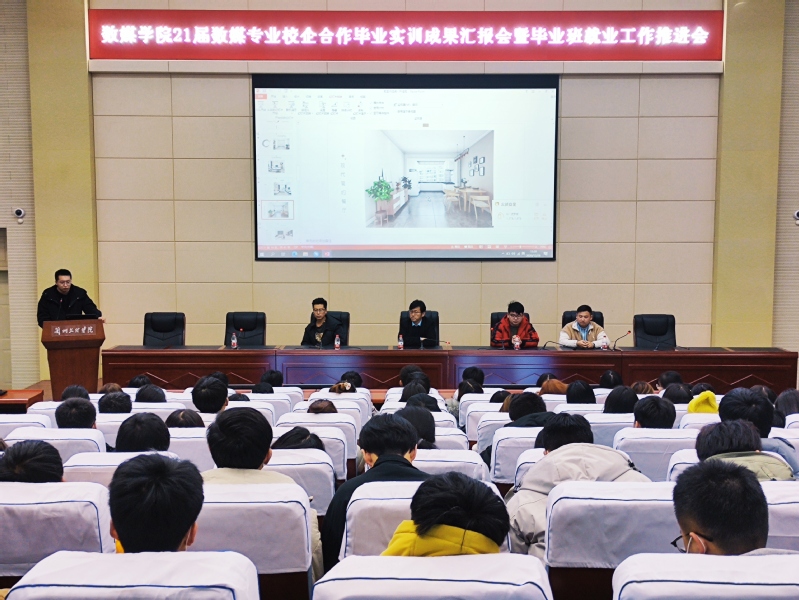 为集中展示yl7703永利21届数字媒体技术、视觉传达设计(数媒方向)本科专业毕业生实训课程的丰硕成果,进一步推进毕业生就业安排工作的开展。数媒学院于12月28日中午在我校学术报告厅召开了“yl7703永利2021届数媒专业校企合作毕业实训成果汇报会暨毕业班工作安排部署推进会”,数媒学院院长李恒杰、创业就业办主任姚林、西安爱克斯未来公司相关负责人出席了此次汇报会,数媒学院17级数媒专业在校学生、18级数媒技术专业及视觉传达设计(数媒方向)专业学生;19级计算机应用专业学生参加了此次汇报会,会议由创业就业办主任姚林主持。