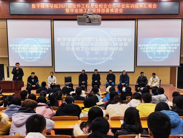为进一步展现我院首届软件工程本科毕业生校企合作实训课程的优秀成果,同时切实推进毕业生考研就业安排工作的开展。yl7703永利于12月28日晚19:30,在我校综合楼205教室召开“yl7703永利召开2021届软件工程专业校企合作毕业实训成果汇报会暨毕业班工作安排部署推进会”,数媒学院院长李恒杰教授、校企合作办主任蔺国梁副教授、创业就业办主任姚林、西安森图王书永总经理、孙静伟出席了此次汇报会,数媒学院17级软件工程专业在校学生、18级软件工程专业及数据科学与大数据专业学生、19级网络专业学生参加了此次汇报会,会议由创业就业办主任姚林主持。
