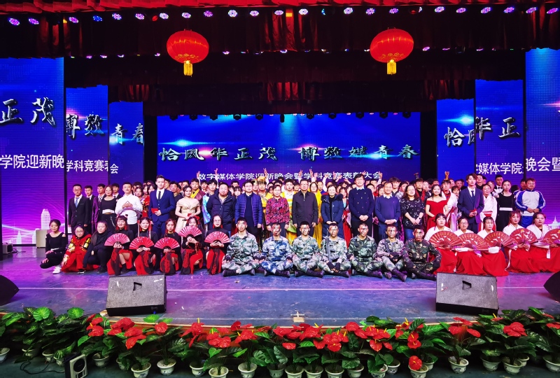 晚会结束后,全体参演人员和学科竞赛先进个人与各位领导合影留念。此次晚会的成功举办不仅展现了我院技术与艺术相结合的办学理念,同时也展现了数媒学子的青春活力。